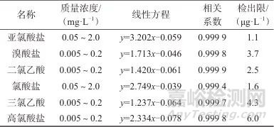 表26種陰離子質(zhì)量濃度線性范圍、線性方程、相關(guān)系數(shù)及檢出限