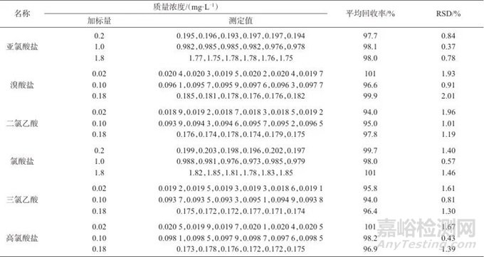 由表3可知,6種陰離子低、中、高3個濃度水平加標(biāo)平均回收率為94.0%~101%,6次測定結(jié)果的相對標(biāo)準(zhǔn)偏差為0.37%~2.01%,表明該方法準(zhǔn)確度和精密度較好。
