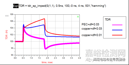 先來看一個實驗,如下圖所示,同樣的模型,我只改變介質(zhì)損耗和導(dǎo)體的電導(dǎo)率,3種情況如下圖所示,紅色就是原始情況,既有導(dǎo)體損耗(默認(rèn)電導(dǎo)率5.8e7)又有介質(zhì)損耗(df=0.01)的情況下,TDR曲線是上翹的。而當(dāng)把介質(zhì)損耗加大到0.03時,紅色TDR變成了藍(lán)色曲線,也就是說上翹減小了,區(qū)域平坦了。這時候,再把銅導(dǎo)體改為PEC,我們發(fā)現(xiàn)藍(lán)色曲線變成了粉色,TDR不但沒有上翹,反而是下降趨勢了。是不是覺得很奇怪,好像從來沒有見過TDR阻抗往下飄的情況。不著急,且聽我娓娓道來。