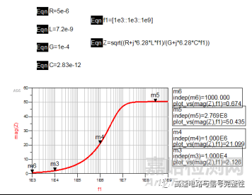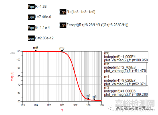 在ads里面可以很方便地使用公式畫出阻抗Z的曲線圖。從圖中可以看出,大約在300MHz以后,阻抗Z就呈現(xiàn)定值,不再隨頻率變化了。那么在1MHz之前,阻抗大約是高頻時候的2.2倍左右達(dá)到110歐姆,也是一個定值。而從1MHz~300MHz之間特征阻抗呈現(xiàn)下降趨勢。這一段頻率范圍稱之為過渡區(qū)。