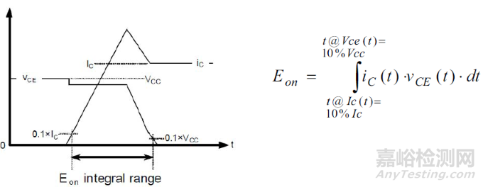 IGBT模塊的turn on與turn off計算方法相同,圖13給出了開關(guān)瞬態(tài)電壓、電流波形及turn on過程的損耗計算公式[8]。