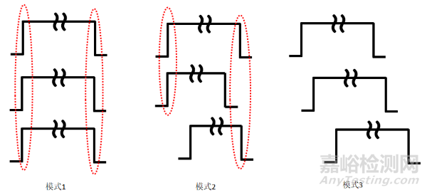 模式2:隨著運行頻率的增加,三個管子波形逐漸錯開,兩個管子的邊沿(上升沿或下降沿)重疊在一起。