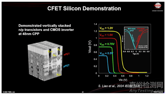 米博士報告稱,臺積電一直在積極構(gòu)建硅基CFET器件,以實現(xiàn)更高水平的微縮。臺積電在2023年IEDM上展示了其首款柵極間距為48納米的CFET晶體管。今年在IEDM上,臺積電展示了最小的CFET反相器。下圖展示了該器件在高達(dá)1.2V電壓下均衡的性能特征。
