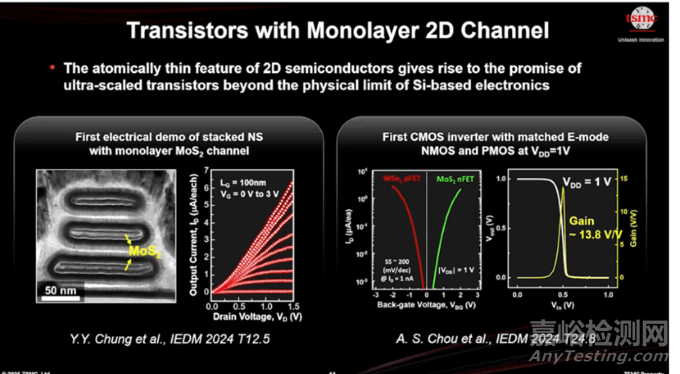 Mii博士報告稱,二維溝道材料晶體管的研究也取得了重大進(jìn)展。臺積電首次展示了類似N2技術(shù)的堆疊納米片架構(gòu)中單層溝道的電性能。此外,他們還開發(fā)了一種采用匹配良好的N溝道和P溝道器件、工作電壓為1V的反相器。下圖總結(jié)了這項工作。