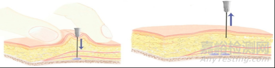 VSDT技術(shù)是在骨膜水平垂直注入填充劑。臨床醫(yī)生用非注射手提起皮膚以實(shí)現(xiàn)最大程度的穿透,并以 90°角在最薄的進(jìn)針點(diǎn)刺穿皮膚。在骨層面,重新定位針頭,在填充材料注入前緩慢推進(jìn)到軟組織下方(圖2)。由于有下方的骨支撐,只需少量填充材料即可顯著矯正缺陷。