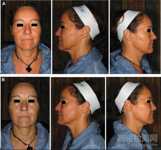 治療后,對(duì)兩個(gè)注射部位進(jìn)行輕輕按摩,以使注入的材料達(dá)到最佳分布。在治療前,將預(yù)裝1.5mL的CaHA注射器與 0.3mL 2% 利多卡因立即混合均勻。該女性還在面部?jī)蓚?cè)的淚溝區(qū)域使用 30G 1/2 英寸針頭注射了透明質(zhì)酸(0.2mL Belotero Balance®)。對(duì)于此治療,在面部右側(cè)使用線性穿線技術(shù),在左側(cè)使用 VSDT技術(shù)(圖1)。