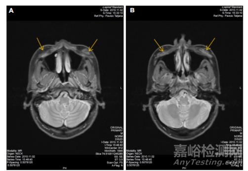 注射CaHA后立即拍攝的MRI圖像顯示,填充劑在骨膜上平面呈對(duì)稱分布(圖 4)。注射約 2.5年后拍攝的圖像顯示未檢測(cè)到 CaHA,表明所有注入的材料已被吸收, 從而證實(shí)了該產(chǎn)品的可生物降解特性(圖5)。如圖5所示,MRI檢查未發(fā)現(xiàn)局部軟組織水腫、不對(duì)稱或病理性增大的區(qū)域淋巴結(jié)。眼眶兩側(cè)的MRI檢查結(jié)果均無(wú)異常,沒(méi)有眶旁或球后浸潤(rùn)或腫塊的證據(jù)。自注射以來(lái)的2.5年內(nèi)未報(bào)告任何并發(fā)癥。