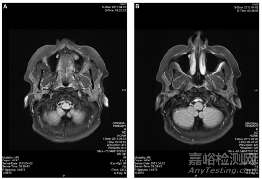 研究對(duì)象是一名50歲女性,在面部?jī)蓚?cè)注射CaHA,在面部右側(cè),使用 28G 3/4 英寸針頭和垂直骨膜上注射技術(shù),將1.6 mL CaHA 分 5 - 7 個(gè)小劑量(0.1 - 0.2mL)進(jìn)行注射;在面部對(duì)側(cè),使用 27G 1 1/2 英寸鈍針和扇形注射技術(shù),通過(guò)三個(gè)進(jìn)針點(diǎn)注射 1.6 mL CaHA。采用磁共振成像(MRI)評(píng)估CaHA的位置和降解情況。(圖1)