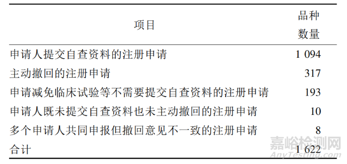 由表 5 可以看出,本次藥物臨床試驗(yàn)數(shù)據(jù)自查涉及 1622 個(gè)品種,其中,申請(qǐng)人提交自查資料的注冊(cè)申請(qǐng)為 1094 個(gè),占 67% ; 主動(dòng)撤回的注冊(cè)申請(qǐng)317 個(gè),占 20% ; 申請(qǐng)減免臨床試驗(yàn)等不需要提交自查資料的注冊(cè)申請(qǐng) 193 個(gè),占 12% 。
