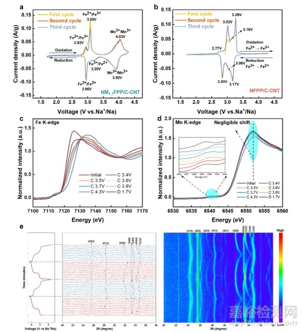 圖2. (a-b) NM1.7FPP/C-CNT and NFPP/C-CNT 在0.1mV s-1掃速條件下的CV曲線; (c-d) NM1.7FPP/C-CNT在不同充放電狀態(tài)下鐵和錳的K邊非原位XANES光譜; (e)NM1.7FPP/C-CNT的原位XRD等高線圖,以及在0.1C倍率下最初兩個循環(huán)過程中相應(yīng)的充放電曲線。