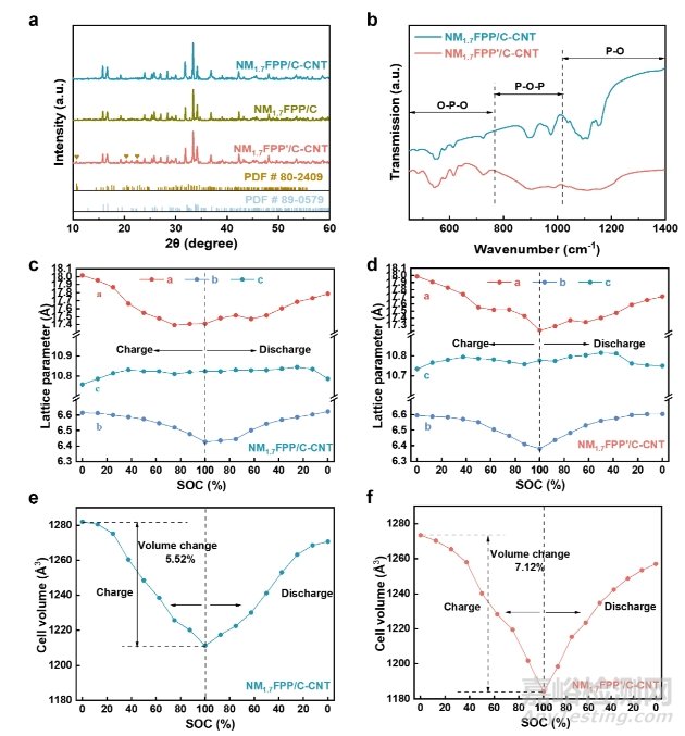 圖3. (a-b)NM1.7FPP/C-CNT, NM1.7FPP/C和NM1.7FPP’/C-CNT的XRD譜圖和FTIR譜圖; (c-d) NM1.7FPP/C-CNT和NM1.7FPP’/C-CNT在不同荷電狀態(tài)下的晶胞參數(shù)a, b和c; (e-f) NM1.7FPP/C-CNT和NM1.7FPP’/C-CNT在不同荷電狀態(tài)下的晶胞體積變化。