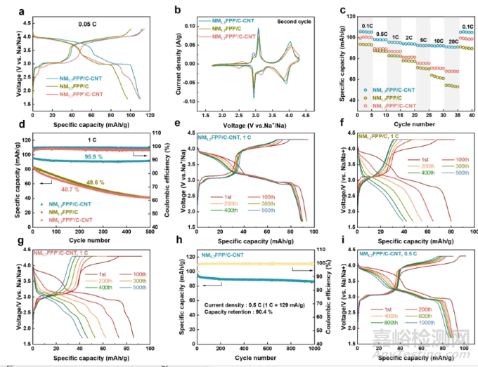 圖4. (a-b) NM1.7FPP/C-CNT, NM1.7FPP/C和NM1.7FPP’/C-CNT正極在0.05C時的第二圈充放電曲線和在掃速為0.1 mV s-1時的CV曲線; (c-d) NM1.7FPP/C-CNT, NM1.7FPP/C和 NM1.7FPP’/C-CNT正極在1C時的倍率性能和循環(huán)性能; (e-g) NM1.7FPP/C-CNT, NM1.7FPP/C 和NM1.7FPP’/C-CNT正極在1C時不同循環(huán)圈數(shù)的充放電曲線; (h) NM1.7FPP/C-CNT正極在0.5C時的循環(huán)性能; (i)NM1.7FPP/C-CNT正極在0.5C時不同循環(huán)圈數(shù)的充放電曲線。