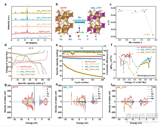 圖1. (a)NMxFPP/C-CNT (x=0, 1.1, 1.7, and 2.3) 的粉末XRD圖; (b) NMxFPP/C-CNT的晶體結(jié)構(gòu)示意圖; (c) NMxFPP/C-CNT (x = 0, 1.1, 1.7, and 2.3)的晶胞參數(shù)a; (d) NMxFPP/C-CNT (x = 0, 1.1, 1.7, and 2.3)正極在0.1C時的恒流充放電曲線圖; (e) NMxFPP/C-CNT (x=0, 1.1, 1.7, and 2.3)正極在1C時的循環(huán)性能圖; (f) NMxFPP/C-CNT(x = 0, 1.7, and 2.3)正極的恒電流間歇滴定技術(shù)曲線圖; (g-i) NMxFPP (x = 0, 1.7, and 2.3)的總態(tài)密度和分波態(tài)密度圖。