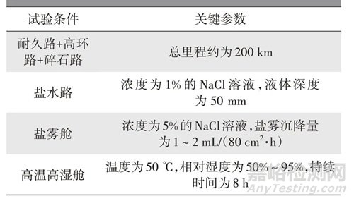 整車強化腐蝕試驗的試驗條件和主要參數(shù)如表2 所示。
