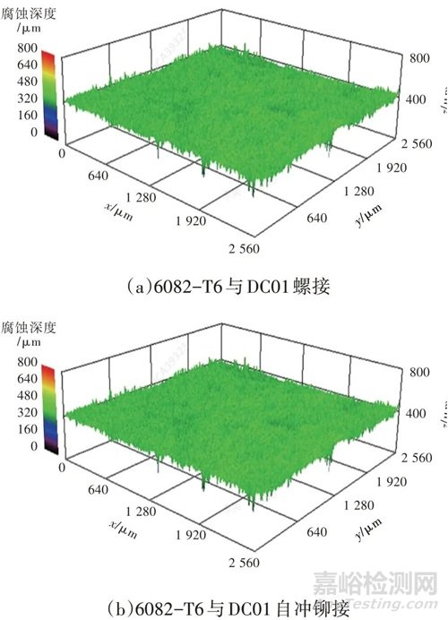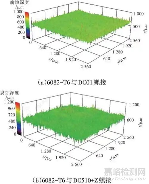 觀察鋁合金與普通碳鋼、鍍鋅鋼整車鹽霧循環(huán)100次后的宏觀腐蝕形貌和微觀腐蝕形貌,發(fā)現(xiàn)均形成了腐蝕坑,且鋁合金的腐蝕深度大于鋼材,普通碳鋼的腐蝕深度大于鍍鋅鋼。鋁合金板材(6082-T6)分別與普通碳鋼(DC01)、鍍鋅鋼(DC51D+Z)螺接,經(jīng)過整車鹽霧循環(huán)100次后,鋁合金板材(6082-T6)的腐蝕深度分別為587.23 μm 和473.16 μm,如圖2所示。腐蝕深度比約為1.24∶1。