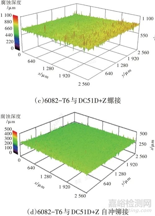 對比鋁合金與普通碳鋼、鍍鋅鋼螺接的腐蝕形貌與鋁合金與普通碳鋼、鍍鋅鋼自沖鉚接的腐蝕形貌,鋁合金螺接的腐蝕程度明顯高于鋁合金自沖鉚接,說明鋁合金與普通碳鋼、鍍鋅鋼板螺接時不僅發(fā)生了電偶腐蝕,還存在縫隙腐蝕。研究表明,縫隙寬度為0.025~0.250 mm 時對縫隙腐蝕最為敏感。自沖鉚接的鈑金間隙<0.025 mm,故自沖鉚接部位很少出現(xiàn)縫隙腐蝕,主要為電偶腐蝕。而鋼鋁螺接的間隙為0.10~0.25 mm,故螺接部位受電偶腐蝕和縫隙腐蝕的共同影響,且同時出現(xiàn)電偶腐蝕與縫隙腐蝕聯(lián)合的部位腐蝕最為嚴重[2]。