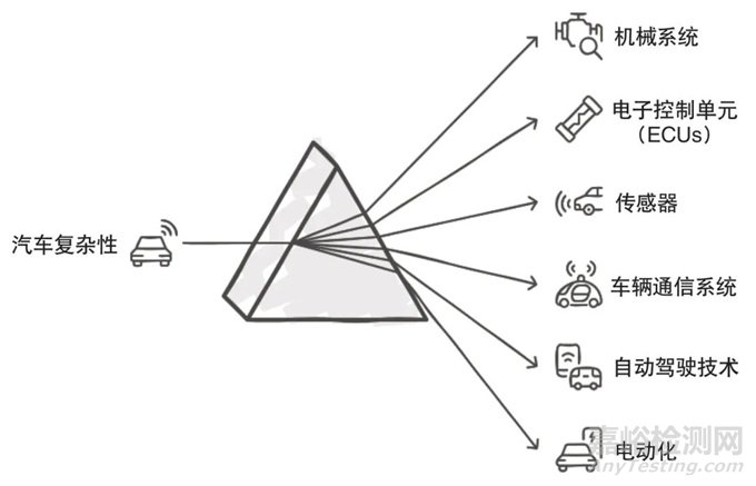 現(xiàn)代汽車技術(shù)的不斷進(jìn)步使得整車結(jié)構(gòu)、電子系統(tǒng)、動(dòng)力總成等變得愈加復(fù)雜,汽車既涉及傳統(tǒng)的機(jī)械系統(tǒng)又包含了大量的電子控制單元(ECU)、傳感器、車載通信系統(tǒng)等,每一個(gè)子系統(tǒng)之間的相互作用、系統(tǒng)的冗余設(shè)計(jì)以及交叉作用關(guān)系,都增加了整車可靠性試驗(yàn)的難度。在傳統(tǒng)的汽車設(shè)計(jì)中,試驗(yàn)往往針對(duì)單個(gè)部件或系統(tǒng)進(jìn)行,可整車可靠性試驗(yàn)涉及的是一個(gè)多維度、多層次的系統(tǒng)評(píng)估,要求從多個(gè)角度考量各個(gè)子系統(tǒng)對(duì)整體性能的影響,這種復(fù)雜性使得每個(gè)部件或子系統(tǒng)的性能偏差都可能對(duì)整個(gè)車輛的可靠性產(chǎn)生深遠(yuǎn)影響[6]。整車的高復(fù)雜度要求在試驗(yàn)設(shè)計(jì)時(shí),既要考慮個(gè)別零部件的性能又要對(duì)其與其他系統(tǒng)的相互作用進(jìn)行充分模擬與評(píng)估,增加了試驗(yàn)過程中的不確定性和難度,其復(fù)雜性如圖2 所示。