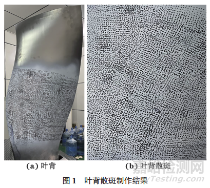 選用試樣為大尺寸葉片,使用自噴漆罐為葉片的葉背噴涂白色啞光底漆,使用滾筒和與散斑相同大小的記號筆在底漆上制作散斑。在試樣表面制作散斑的步驟尤其重要,此步驟可以為分析區(qū)域提供良好的特征,保證正確的散斑位移追蹤直接關(guān)系到標(biāo)定時的不確定度,以及散斑照片的質(zhì)量。為了避免形成反光并且有較好的對比度,使用的白色底漆與黑色散斑漆同為啞光漆,白色底漆覆蓋均勻,黑色散斑清楚無涂抹。同時,拍攝一組靜止照片進(jìn)行觀察,散斑點(diǎn)的大小需有較好的一致性,放大觀察后散斑點(diǎn)的大小應(yīng)占5~10個像素點(diǎn),否則容易造成分析時的混淆。照片視野中,散斑在白色底漆上應(yīng)有50%的覆蓋率,因此需要兩散斑的點(diǎn)間距與散斑點(diǎn)的大小一致。為了避免錯誤匹配,試樣表面制作的散斑應(yīng)具有隨機(jī)性,因此不要制作大面積復(fù)制的散斑圖案。葉片散斑制作結(jié)果如圖1所示。
