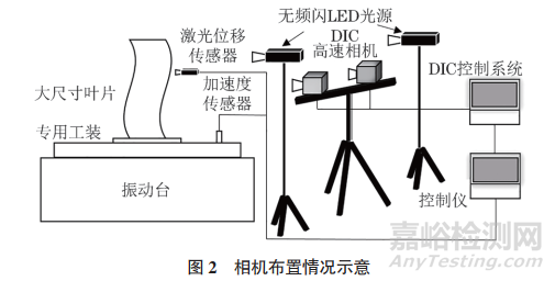 正式試驗(yàn)開始前,對DIC系統(tǒng)進(jìn)行校準(zhǔn),對大尺寸葉片進(jìn)行標(biāo)定。選擇具有可識別既定尺寸點(diǎn)功能的標(biāo)定板,建立坐標(biāo)系并識別空間尺寸,修正鏡頭引起的光學(xué)畸變。標(biāo)定結(jié)果用于確定相機(jī)距離、角度等參數(shù),并在結(jié)果中生成不確定度,不確定度小于0.04被認(rèn)為是合理的標(biāo)定不確定度范圍。搭建DIC三維動態(tài)全場應(yīng)變測量系統(tǒng),該系統(tǒng)主要包括三腳架、兩臺無頻閃LED(發(fā)光二級管)光源、標(biāo)定組件、散斑制作工具、VIC-Snap圖像采集系統(tǒng)和VIC-3D圖像處理系統(tǒng)等。打開圖像采集系統(tǒng)軟件,保證軟件中兩臺相機(jī)視野能獲得大尺寸葉片葉背視角下的最大面積,散斑面積占視野的60%~70%。使用等效焦距為50mm的定焦鏡頭,鏡頭的攝像角度為46°,最近對焦距離為0.45m,光圈值F為1.8~22,光圈孔徑=焦距/F,F(xiàn)越小,進(jìn)光量越多,因此要避免使用最大光圈和最小光圈。設(shè)置軟件參數(shù),為了保證采集照片的清晰度,需架設(shè)無頻閃LED白光光源,選用F為8的光圈,以獲得最佳畫質(zhì)。采用的分辨率為2048像素×1952像素。大尺寸葉片的一階振動頻率較低,因此選用幀率為1000幀/s來采集照片,使應(yīng)變曲線平滑。調(diào)整光圈,使視野中散斑圖像清晰,且擁有較低的不確定度。要保證大尺寸葉片在視野中更清晰,需要在開啟相機(jī)和采集軟件的前提下,對照視野畫幅調(diào)整相機(jī)的位置和角度。相機(jī)布置情況如圖2所示。