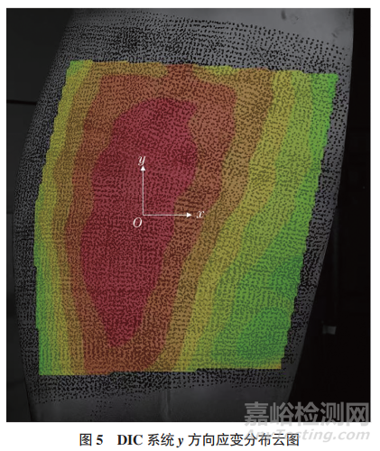 使用DIC動態(tài)全場三維應(yīng)變測試儀對葉背進(jìn)行應(yīng)變測量,獲得的y方向應(yīng)變分布云圖及應(yīng)變測量結(jié)果分別如圖5,6所示。