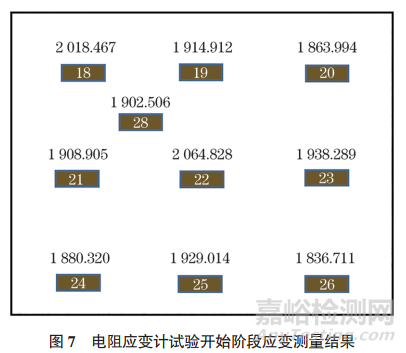 通過電阻應(yīng)變計及Coda應(yīng)變測試儀測試,在同一應(yīng)力水平下,試驗(yàn)開始階段應(yīng)變測量結(jié)果 如圖7所示,其中22號電阻應(yīng)變片位置為理論最大應(yīng)變點(diǎn)位置。