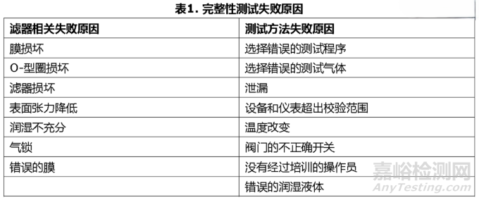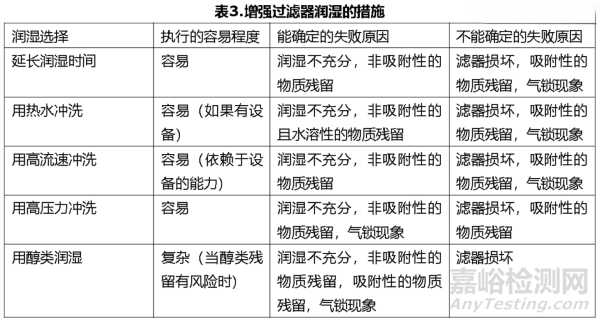如果第一次測試失敗,通??赡軙M行簡單的重新潤濕,然后再測試。如果測試失敗的原因是由于潤濕不充分,那么重新潤濕可以解決這個問題,得到“通過”的結(jié)果。但正如表1所列,潤濕不充分只是眾多失敗原因中的一個,如果忽略了其他原因,可能會導(dǎo)致重復(fù)失敗。所以在重新測試之前,我們建議根據(jù)表1列出的失敗原因,同時檢查系統(tǒng),測試操作和過濾器等參數(shù)。其中表2中斜體加粗的失敗原因,不用重新測試即可確認(rèn)是否存在問題。