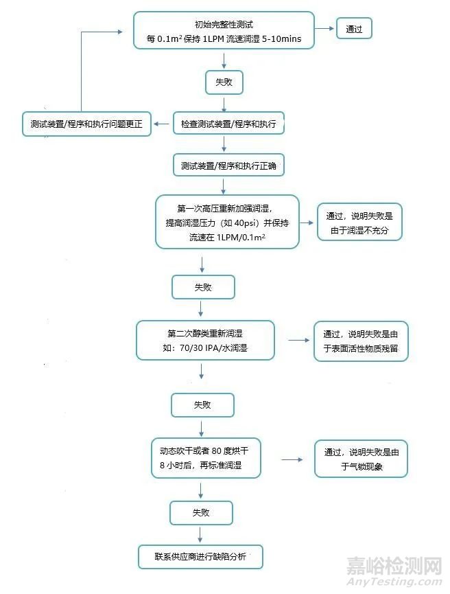一個完整的完整性測試問題分析流程圖如下圖所示,我們建議根據(jù)下面的流程建立一個標(biāo)準(zhǔn)的流程(SOP)來分析失敗的原因,然后采取正確的措施,并重新進行測試??赡苡袝r候并不能完全確定失敗的原因,例如,利用高壓重新潤濕也能夠簡單地去除掉表面活性物質(zhì),因為它增加了額外的沖刷。但是基于邏輯和典型已知的完整性測試失敗模型,應(yīng)該能提供有效的流程來解決失敗的問題,并采取正確的措施。
