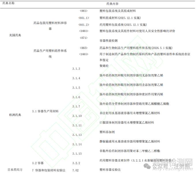 《美國(guó)藥典》目前<661>包含聚乙烯、聚丙烯、聚對(duì)苯二甲酸乙二醇酯容器,以及熱分析、生物測(cè)試、理化測(cè)試方法等內(nèi)容。2025 年 12 月 1 日正式生效的<661.1>和<661.2>涉及塑料材料和塑料包裝系統(tǒng),且材料部分會(huì)增加環(huán)烯烴聚合物、聚酰胺等材質(zhì)[3];《歐洲藥典》塑料標(biāo)準(zhǔn)收入了較為詳細(xì)的塑料材料部分(包含材料鑒別和水溶出物、可提取元素、添加劑檢查等)和容器部分[4];《日本藥局方》有塑料容器實(shí)驗(yàn)法和通用信息內(nèi)容(藥用塑料容器和輸液容器用橡膠密封件的基本要求)[5]。相較于國(guó)外藥典,2020 年版《中國(guó)藥典》藥包材標(biāo)準(zhǔn)中,除部分方法標(biāo)準(zhǔn)外,沒(méi)有塑料類藥包材相關(guān)標(biāo)準(zhǔn)。