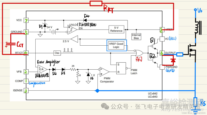 UC3842是AC-DC反激式變壓器中常用的電源管理芯片,其具有較低的啟動(dòng)電流(<1mA),并且可以在高達(dá)500KHz頻率下工作,在輸出端輸出可脈寬調(diào)制的PWM波來驅(qū)動(dòng)NMOSFET,并且在MOS管關(guān)斷時(shí)具有較低的功耗。