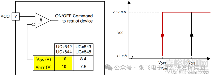電源初始供電后,芯片在1mA以下啟動(dòng)電流下工作在欠壓鎖定輸出UVLO狀態(tài)下。如圖2所示,UVLO部分比較器反相輸入端接電源(應(yīng)該不是固定電壓),同相輸入端接VCC,通過比較VCC供電電壓與內(nèi)部開啟/關(guān)斷電壓來控制供電電流,具體工作方式圖4。
