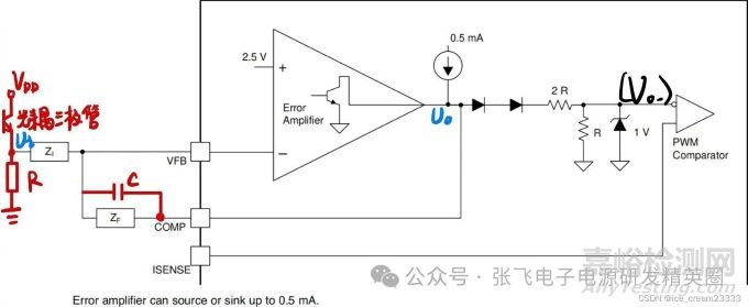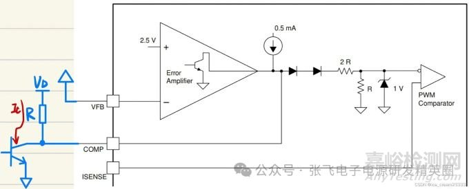 其中Ui由光耦三極管電流及電阻R決定,因此可以通過配置阻抗網(wǎng)絡(luò)、設(shè)置光耦工作電流區(qū)域來設(shè)置COMP端電壓,從而調(diào)控PWM波占空比(具體COMP端需要怎么設(shè)置呢?)、