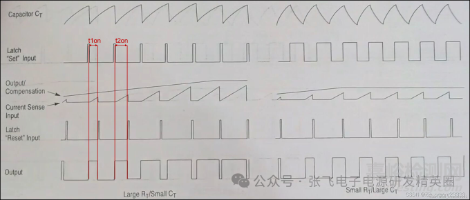 左圖為大電阻小電容,充電慢放電快,則PWM Latch "Set"端占空比小,芯片OUTPUT輸出PWM波占空比可調(diào)范圍大,右圖為小電阻大電容,充電快放電慢,則PWM Latch "Set"端占空比大,芯片OUTPUT輸出PWM波占空比可調(diào)范圍小。