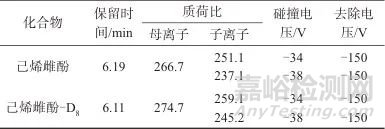 表2 己烯雌酚及其內(nèi)標物的質(zhì)譜參數(shù)
