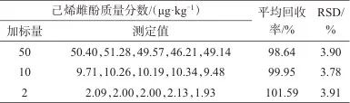 取各個質(zhì)量濃度的系列己烯雌酚標準工作液,依次上機測試,以目標物濃度為橫坐標,色譜峰面積比為縱坐標,繪制標準曲線,得到線性回歸方程為y=141 175x+23 441,相關(guān)系數(shù)為0.998,質(zhì)量濃度線性范圍為0.5~50.0 μg/L。按3倍信噪比計算檢出限,按10倍信噪比計算定量限,得到檢出限和定量限分別為0.04、0.14 μg/kg。