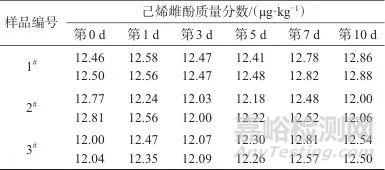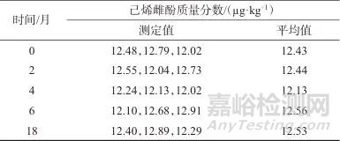 由結(jié)果數(shù)據(jù)可以計算出25、60 ℃下的F值分別為2.58和2.52,均小于F臨界值(分別為2.76和2.53),說明標準樣品在運輸條件(25±2) ℃ 7 d內(nèi)和(60±2) ℃ 10 d內(nèi),樣品中己烯雌酚含量均無顯著變化,樣品的短期穩(wěn)定性符合要求。