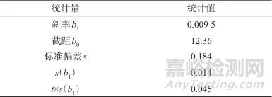 長期穩(wěn)定性采用特性值隨時間變化的曲線來判斷是否具有單方向變化趨勢。X表示穩(wěn)定性考察時間,Y表示穩(wěn)定性考察結(jié)果,則存在Y=b0-b1X,b1、b0分別為斜率和截距。對于穩(wěn)定的標準樣品,b1的期望值為零。用t檢驗來檢驗斜率是否顯著不等于零,若|b1|<t×s(b1),表明斜率不顯著,沒有觀察到不穩(wěn)定性。表7和表8分別為長期穩(wěn)定性測定結(jié)果和長期穩(wěn)定性趨勢分析結(jié)果。由表8可知,乳粉中己烯雌酚擬合直線斜率|b1|<t×s(b1),斜率不顯著,說明樣品在18個月內(nèi)穩(wěn)定。