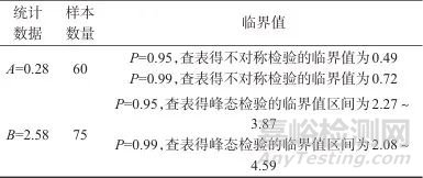 采用偏態(tài)系數(shù)和峰態(tài)系數(shù)法進行正態(tài)性檢驗,若該組測量數(shù)據(jù)服從正態(tài)分布,則偏態(tài)系數(shù)A和峰態(tài)系數(shù)B應(yīng)分別小于相應(yīng)的臨界值和落入?yún)^(qū)間中。表10為正態(tài)性檢驗數(shù)據(jù)。由表10可以看出,A=0.28,小于臨界值0.49,且B在P=0.95所對應(yīng)的臨界值范圍內(nèi),說明數(shù)據(jù)為正態(tài)分布。