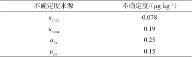 合成標準不確定度按式(1)計算,得uCRM=0.4 μg/kg,取包含因子k=2,擴展不確定度U=0.8 μg/kg。