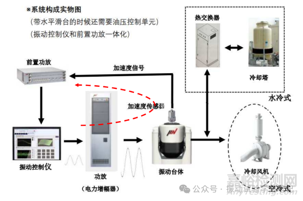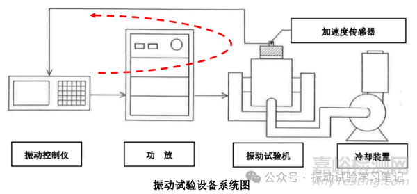 有開(kāi)環(huán),那肯定有閉環(huán)。要想掌握這個(gè)概念必須要理解振動(dòng)試驗(yàn)設(shè)備系統(tǒng)中最重要的一個(gè)環(huán),閉環(huán)控制中的控制環(huán)路。也就是我經(jīng)常提到的那張系統(tǒng)圖,如下所示,振動(dòng)控制儀中輸入試驗(yàn)條件,產(chǎn)生振動(dòng)波形,功放放大后,驅(qū)動(dòng)振動(dòng)試驗(yàn)機(jī)振動(dòng),加速度傳感器感知加速度量級(jí),反饋給振動(dòng)控制儀(響應(yīng)),實(shí)現(xiàn)振動(dòng)控制(振動(dòng)試驗(yàn)機(jī)運(yùn)行產(chǎn)生的熱量,冷卻裝置對(duì)應(yīng)冷卻),我們說(shuō)的就是這個(gè)閉環(huán)。