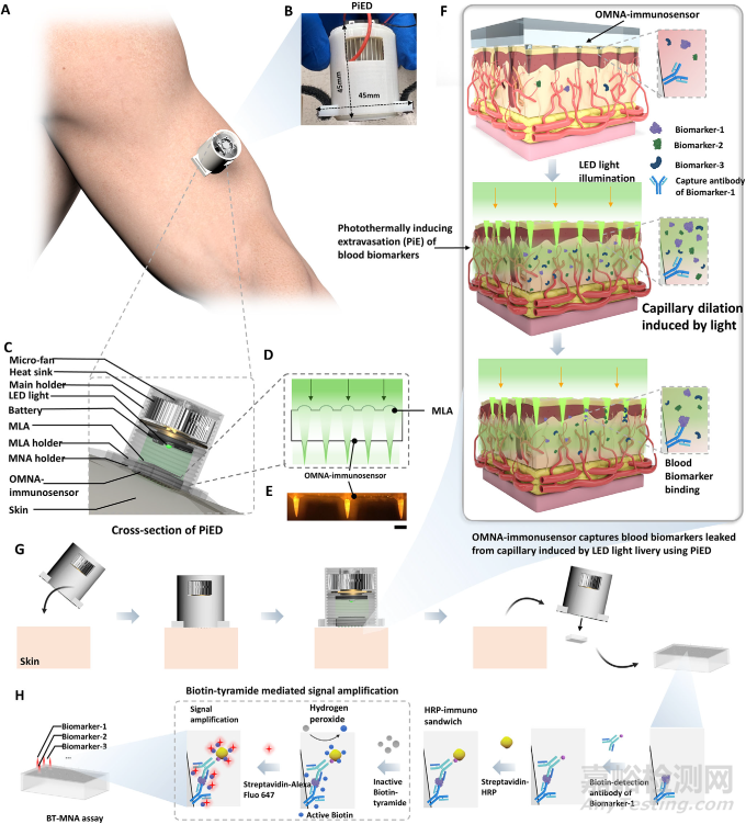 圖1 光熱誘導(dǎo)外滲裝置(PiED) 用于血液采樣和血液生物標(biāo)志物的多重檢測