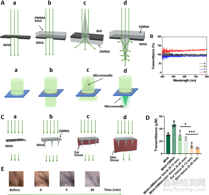 其工作原理堪稱巧妙。LED光(595 nm)通過MLA聚焦后,沿著每根微針精準(zhǔn)地傳導(dǎo)進入皮膚,直達毛細血管密集的真皮層。光在這里并不是單純的“照亮”,而是通過溫和的光熱效應(yīng)引發(fā)毛細血管短暫擴張,從而使血液中的生物標(biāo)志物“滲出”到真皮層,而不會造成出血或組織損傷。