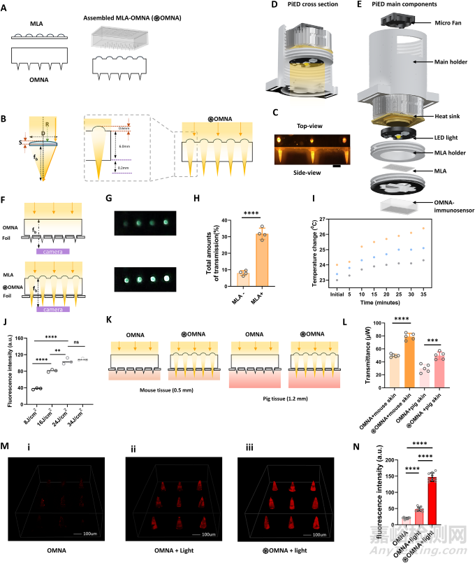 這項創(chuàng)新的核心,是一個直徑約4厘米的圓柱形設(shè)備——看起來像是一個超迷你的“實驗室”。它由三大核心部件構(gòu)成:微透鏡陣列(MLA)、光學(xué)微針陣列(OMNA)以及LED光源。