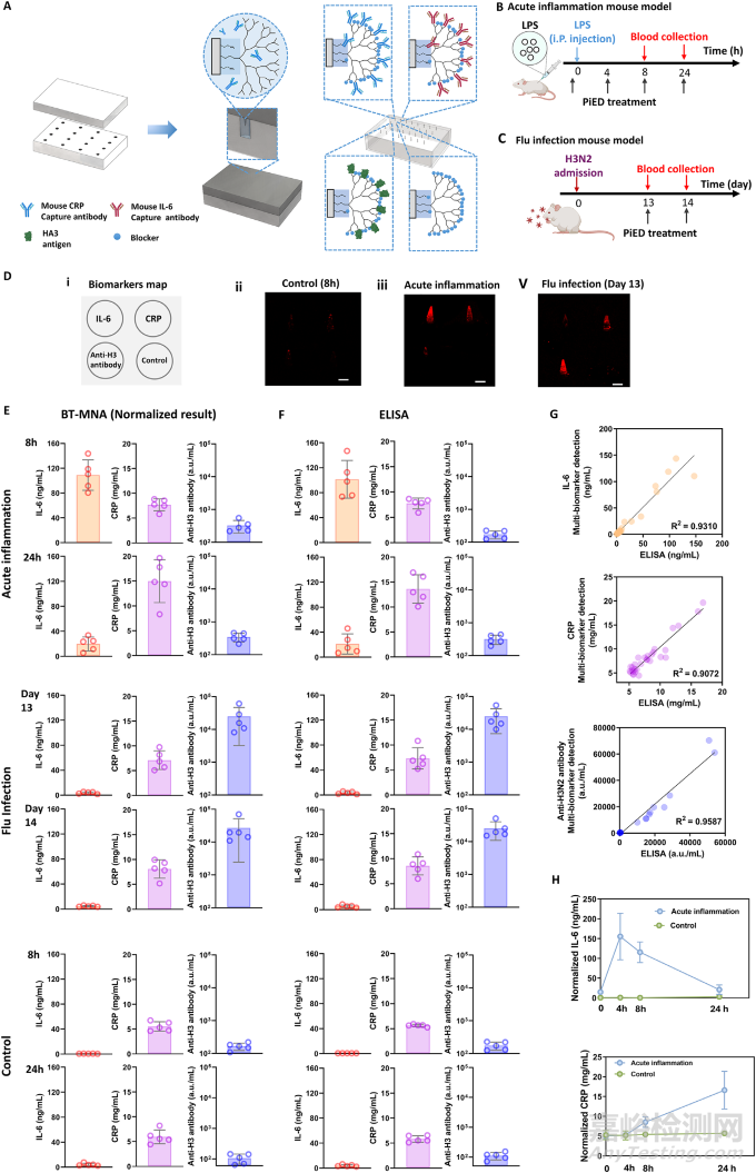 然而,現(xiàn)有的家用檢測產(chǎn)品如血糖儀、抗原快速檢測棒,大多只能測單一樣本指標(biāo)。而該設(shè)備的突破之一,就是在一次操作中同時檢測多個生物標(biāo)志物。在小鼠實驗中,研究團隊檢測了C反應(yīng)蛋白(CRP)、白細胞介素6(IL-6)和流感病毒特異性抗體三種指標(biāo),不僅成功區(qū)分了細菌感染與病毒感染,還驗證了該方法對炎癥監(jiān)測的高效性。