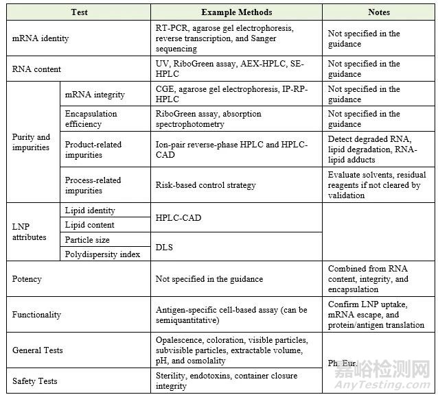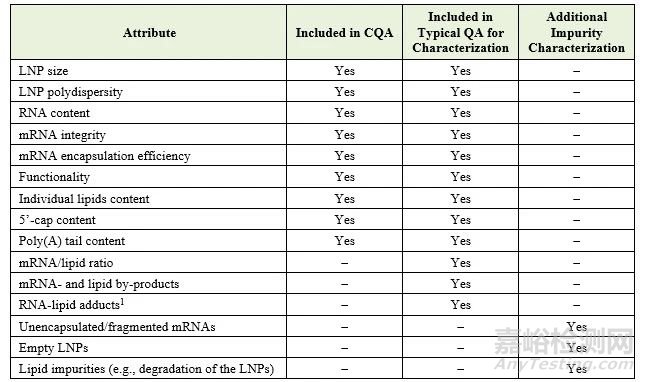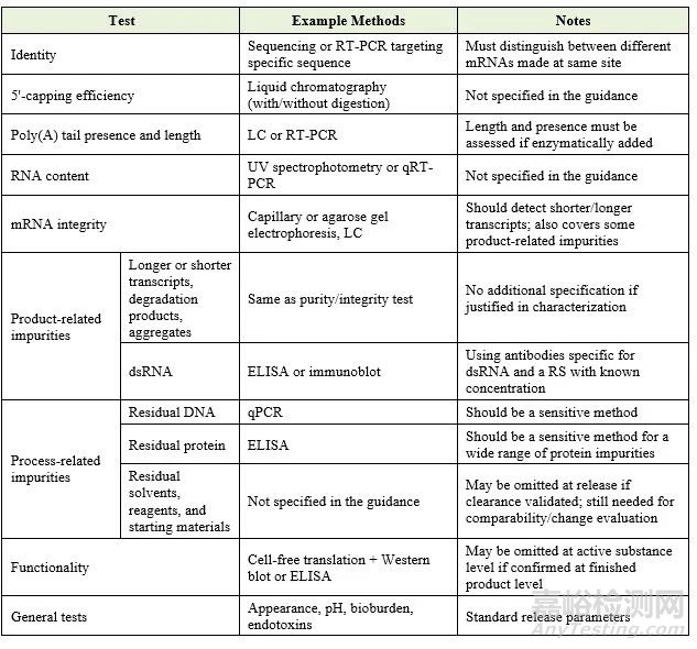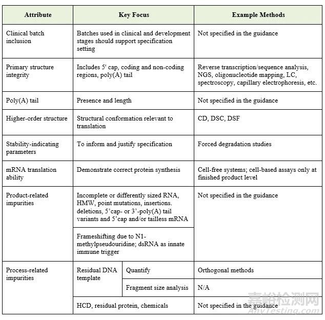 該指南對(duì)mRNA的釋放檢測(cè)設(shè)定了明確的要求。規(guī)格限度應(yīng)根據(jù) ICH Q6B 進(jìn)行臨床驗(yàn)證。下表總結(jié)了藥品釋放時(shí)需要控制和監(jiān)控的關(guān)鍵屬性: