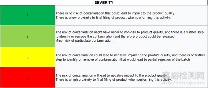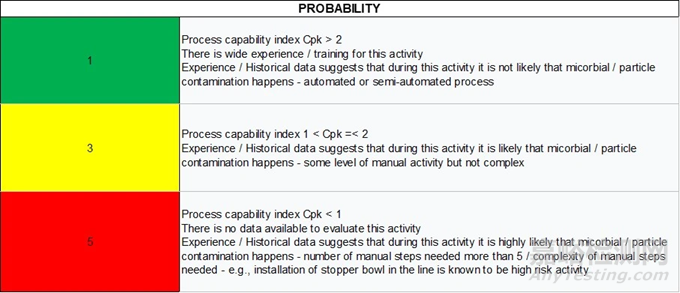 如表 2 中所定義的,評(píng)分為 1 意味著在評(píng)估的活動(dòng)過程中,不太可能發(fā)生微生物、顆?;蚧瘜W(xué)污染。污染的類型將取決于所評(píng)估的步驟。例如,在清潔步驟中,風(fēng)險(xiǎn)主要是化學(xué)污染或交叉污染。為了評(píng)估可能性,如果有足夠的數(shù)據(jù)進(jìn)行能力分析,就可以采用這種方式。如果沒有足夠數(shù)據(jù),表 2 中的等級(jí)給出了其他評(píng)估選項(xiàng),比如依據(jù)自動(dòng)化水平、經(jīng)驗(yàn)或已發(fā)表的文獻(xiàn)來評(píng)估。