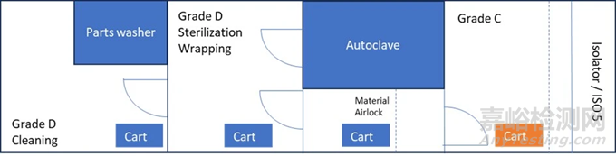 這些物料的轉(zhuǎn)移取決于它們的包裝形式。如果使用的產(chǎn)品是即用型(RTU)擦拭布,它們是無菌的且采用雙層包裝??梢允褂脠D 2 所示的物料氣閘進(jìn)行轉(zhuǎn)移,在 D 級(jí)區(qū)域內(nèi)移除第一層包裝,然后將擦拭布放置在 C 級(jí)區(qū)域的推車上。在使用擦拭布之前,應(yīng)在隔離器內(nèi)或隔離器的物料氣閘中移除最后一層包裝。