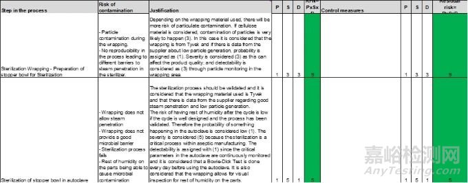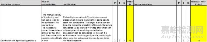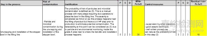 這一步驟的主要風(fēng)險(xiǎn)是清潔不成功。在這一干預(yù)過程中存在引入污染的風(fēng)險(xiǎn);然而,在這種類型的清潔方面有經(jīng)驗(yàn)的制造商報(bào)告說,這種風(fēng)險(xiǎn)非常低。應(yīng)根據(jù)歷史數(shù)據(jù)和每個(gè)制造商的經(jīng)驗(yàn)來修訂和評(píng)估這種風(fēng)險(xiǎn)的可能性,因?yàn)檫@將取決于殘留物、所使用的清潔劑、操作程序和灌裝線的設(shè)計(jì)。在本示例中,殘留物被認(rèn)為是硅油。清潔不成功的可能性可被認(rèn)為評(píng)分為 3 甚至 5,因?yàn)檫@是一個(gè)手動(dòng)過程,并且硅油是一種難以清潔的殘留物。由于難以通過目視檢查評(píng)估硅酮?dú)埩粑?,可檢測(cè)性評(píng)分為 5。嚴(yán)重程度評(píng)分為 2,因?yàn)檫@種殘留物不會(huì)影響產(chǎn)品質(zhì)量。這使得風(fēng)險(xiǎn)優(yōu)先數(shù)(RPN)在 30 到 50 之間,屬于中高風(fēng)險(xiǎn)。如果使用實(shí)驗(yàn)室模型來設(shè)計(jì)清潔程序,這種風(fēng)險(xiǎn)的可能性可以降低到評(píng)分為 3。這將導(dǎo)致風(fēng)險(xiǎn)優(yōu)先數(shù)(RPN)在 10 到 30 之間。如果殘留物易于清潔,清潔不成功的可能性可以降低到評(píng)分為 1,風(fēng)險(xiǎn)優(yōu)先數(shù)(RPN)為 10。
