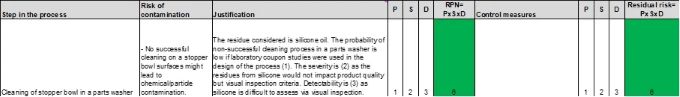 The main risk during this step is not having a successful cleaning. There is a risk of introducing contamination during this intervention; however, manufacturers with experience in this type of cleaning report that the risk is very low. The probability of this risk should be revised and assessed based on historical data and the experience of each manufacturer as this will depend on the residue, the cleaning agents used, the procedure and the design of the filling line. For this example, the residue is considered to be silicone oil. The probability of an unsuccessful cleaning can be considered a rating of 3or even a5because this is a manual process, and silicone oil is a hard-to-clean residue. Due to the difficulties of assessing silicone residue via visual inspection, the detectability is assigned as a rating of5. Severity is assigned a2rating as this residue would not impact product quality. This gives an RPN between30and50, middle-to-high risk. The probability of this risk can be reduced to rating of3if a laboratory model is used to design the cleaning procedure. This would result in an RPN between10and30. If the residue is easy to clean, the probability of having an unsuccessful cleaning can be reduced to a 1, resulting in an RPN of10.