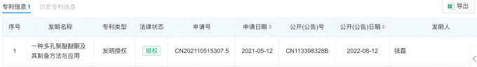 據(jù)查詢(xún)顯示,目前蘇州云合景從新材料科技有限公司擁有“多孔聚醚醚酮及其制備方法與應(yīng)用”專(zhuān)利技術(shù),據(jù)介紹,該專(zhuān)利以塊體或片材PEEK材料為主體,通過(guò)熱壓法將無(wú)機(jī)顆粒融入PEEK表面,然后采用溶液溶解無(wú)機(jī)顆粒,從而在PEEK材料表面形成一層多孔結(jié)構(gòu)。