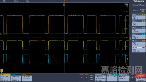 圖a為CAN通訊電路接了終端電阻,但是未添加到地電容的測試波形;圖b為CAN通訊電路接了終端電阻,并且也添加到地電容的測試波形。